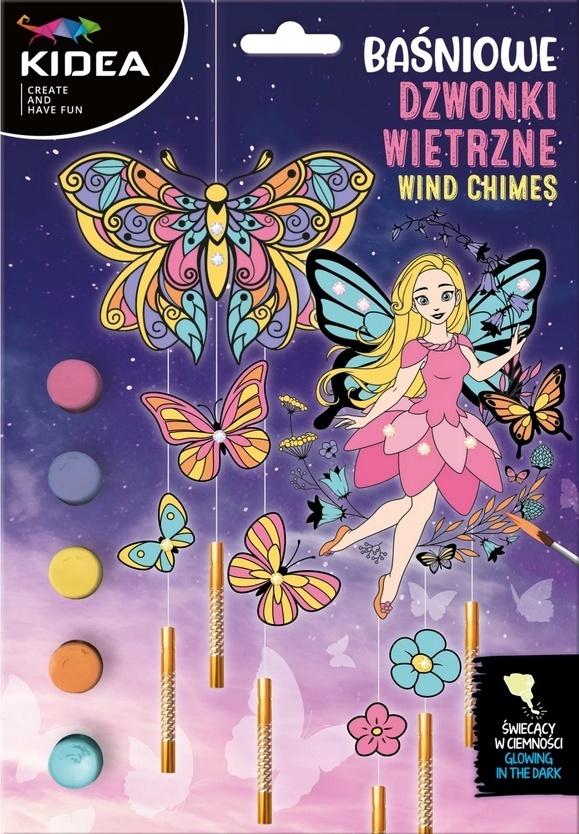 Magiczne dzwonki wietrzne świecące w ciemności. Zaprojektuj swoje własne dzwonki z tekturowym szablonem wróżki i pięknego motylka otoczonymi baśniowymi elementami, które pięknie ozdobią pokój. Zestaw zawiera wszystko co jest potrzebne do stworzenia niesamowitej dekoracji. Kompletny zestaw kreatywny zawiera 6 dzwonków, 12 ozdobnych diamencików, 7 tekturowych szablonów do malowania, 5 kolorów farb z pędzelkiem, żel. świecący w ciemności oraz sznurek do montażu. Dzięki specjalnemu klejowi świecącemu gotowa dekoracja będzie magicznie lśnić po zmroku, tworząc nastrojową atmosferę w pomieszczeniu. Zestaw gwarantuje godziny twórczej zabawy, a efekt końcowy to wyjątkowa dekoracja wnętrza.