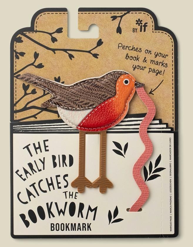 The Early Bird Catches the Bookworm - zakładka do książki w kształcie uroczego ptaszka z miękkiej, pikowanej skóry ekologicznej. Sprytne śmieszne nóżki działają jak klips - "przesiada się" na stronę na końcu książki, a robaczek wisi i elegancko oznacza miejsce. Idealny prezent dla książkowych robaków i miłośników ptaków. Zabawny, praktyczny i po prostu uroczy.