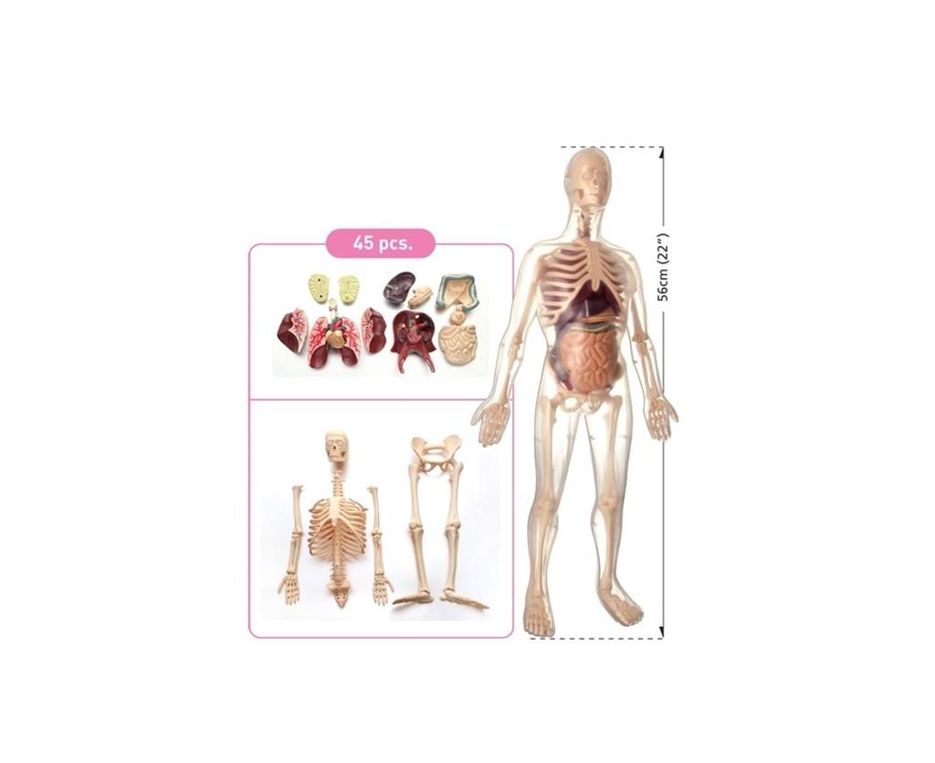 Model Człowieka - Mężczyzna Jest to model ludzkiego ciała o długości 56 cm i zawiera 45 elementów. Wiek 8+ Ten model bardzo dokładnie i realistycznie pokazuje ważne części ludzkiego ciała. Dowiemy się jak funkcjonuje organizm poprzez wyciąganie pojedynczych narządów oraz zobaczymy jak pracują one nawzajem ze sobą by utrzymać człowieka żywego i zdrowego. Wykonany jest z lekkich, przezroczystych tworzyw sztucznych. Model MK002 jest bardzo łatwy w montażu i służy do edukacji, zabawy, a także może być używany do pokazów przez biologów czy lekarzy. Posiada instrukcje w języku polskim, która w bardzo szczegółowy sposób opisuje wszystkie części ciała, a także opisuje jak funkcjonują poszczególne układy, a na koniec możemy przeczytać o kilku ciekawostkach związanych z naszym organizmem.