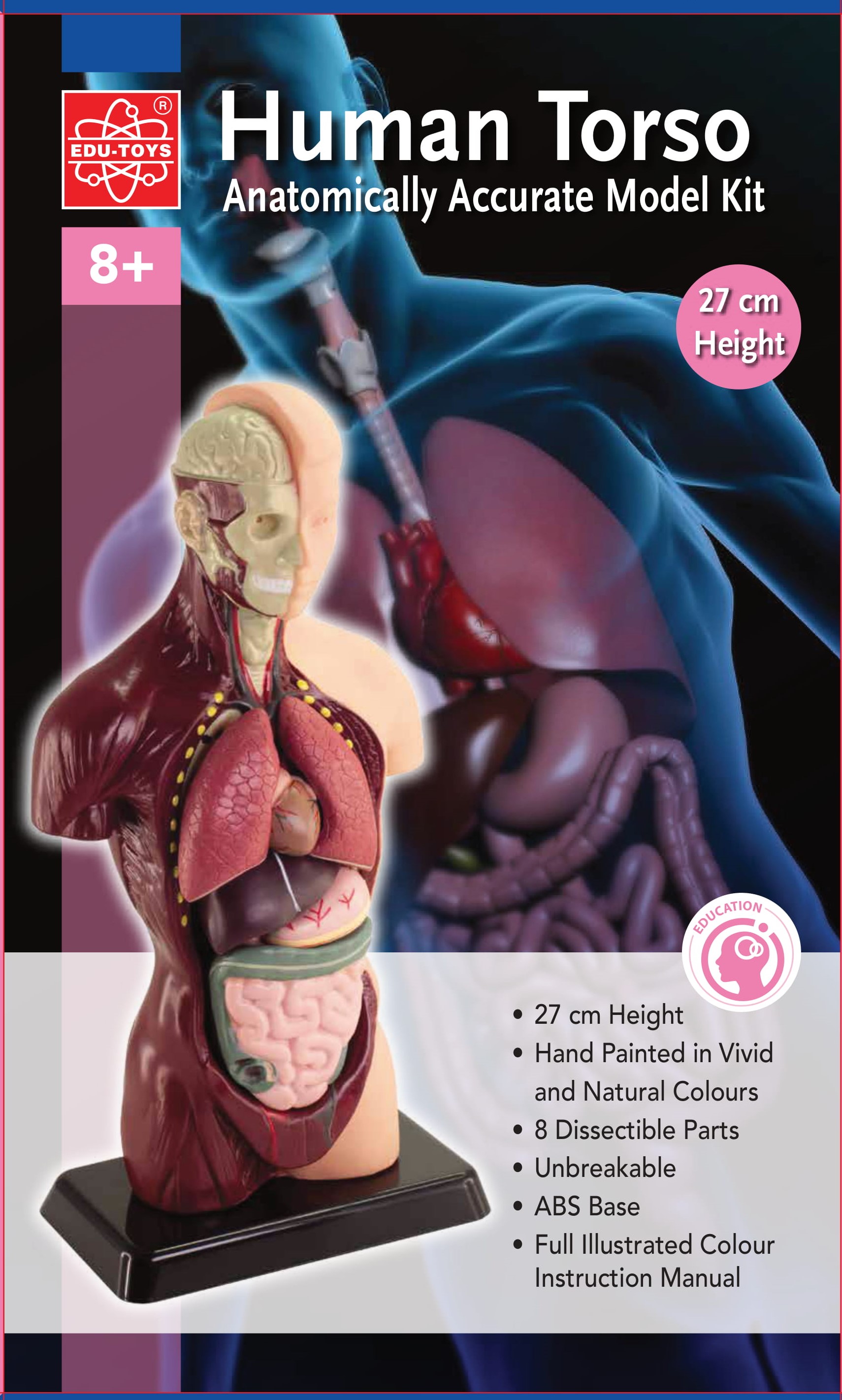 Ten anatomicznie dokładny model pokazuje wszystkie główne narządy. Zawiera realistycznie ręcznie malowane części ciała, które można usunąć, obserwować i ułożyć z powrotem we właściwych pozycjach w ciele. Wiek: 8 lat Nr produktu: MK027 Wysokość produktu 27 cm Elementy są ręcznie malowane w żywych i naturalnych kolorach 8 części W pełni ilustrowana instrukcja obsługi w języku polskim.