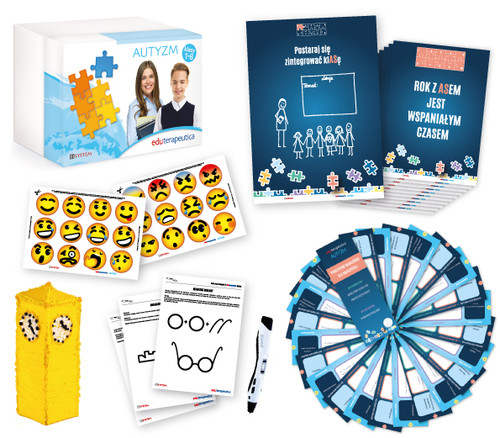 Eduterapeutica Autyzm 7-15 lat Materiały dla pedagoga i nauczyciela Eduterapeutica Autyzm to jedyny taki system wspierający całe grono pedagogiczne. Jest to zbiór praktycznych i różnorodnych materiałów zebranych w jednym miejscu. W pakiecie zawarto przydatne wskazówki, szczególnie dla nauczycieli klas 1-8, jak zachować się w pracy z uczniem ze spektrum autyzmu oraz jak przygotować całą klasę do integracji z uczniem z ASD. Scenariusze zajęć i pomoce mają służyć do nawiązania dobrych relacji i komunikacji między nauczycielem a uczniem z ASD, natomiast zadania i ćwiczenia dla wszystkich uczniów ułatwiają pokonanie dystansu fizycznego i pomagają w rozwijaniu kompetencji społecznych u osób z zaburzeniami ze spektrum autyzmu. Pakiet zawiera: 2 poradniki dla nauczycieli/wychowawców: „Jak prowadzić lekcje w klasach, w których są uczniowie ze spektrum autyzmu?” oraz „Dom – szkoła – klasa w trosce o ASA, czyli jak współpracować z Rodzicami ucznia z ASD?” Ponad 60 zabaw wspierających relacje i komunikację między uczniami, Blisko 20 kart pracy integrujących uczniów, 2 prezentacje multimedialne dla pedagoga do przeprowadzenia wewnętrznych szkoleń doskonalenia nauczycieli, praktyczne fiszki dla nauczycieli z podpowiedziami, jak wykorzystać mocne strony ucznia z ASD podczas zajęć w szkole, buźki – emotikonki: zarówno te już gotowe jak i do samodzielnego wykonania, pomocne w komunikowaniu się z uczniami, 11 plakatów edukacyjnych (do powieszenia np. w pokoju nauczycielskim), dostęp do zbioru filmów edukacyjnych o dzieciach i młodzieży ASD, długopis Banach 3D z 10 kartami pracy do stosowania na zajęciach rewalidacyjno-kompensacyjnych. Pracując z długopisem uczniowie z ASD uczą się koncentracji, cierpliwości, ćwiczą umiejętności manualne (np. właściwy chwyt pisarski); praca z długopisem 3D wyzwala pozytywne emocje, które wspomagają proces uczenia. O autorach dr Joanna Buława-Halasz – w 2008 roku ukończyła studia magisterskie na Uniwersytecie Szczecińskim na kierunku pedagogika rewalidacyjna i korekcyjna, a także studia pierwszego stopnia na kierunku socjologia w zakresie specjalności „Doradztwo psychospołeczne”. W trakcie studiów magisterskich pracowała jako asystentka osób z autyzmem w szczecińskim oddziale Krajowego Towarzystwa Autyzmu, a po studiach podjęła tam pracę jako terapeutka. Ponadto odbyła liczne staże i wolontariaty w miejscach poświęconych przede wszystkim rehabilitacji społecznej i zawodowej dorosłych osób autystycznych. Pracowała również jako nauczyciel wspierający w grupie w przedszkolu integracyjnym, a następnie jako nauczyciel terapeuta w terapii indywidualnej w przedszkolu integracyjnym. Adiunkt w Katedrze Pedagogiki Specjalnej w Instytucie Pedagogiki Uniwersytetu Szczecińskiego. Współzałożycielka Centrum Wspierania Rozwoju Dziecka „MANUfaktura” w Szczecinie i Terapeutycznego Punktu Przedszkolnego „Akademia Słonia Trąbalskiego” w Szczecinie. Jest współautorką lub autorką dwudziestu publikacji naukowych, w tym monografii zatytułowanej „Rehabilitacja społeczna i zawodowa dorosłych osób autystycznych. Studium fenomenograficzne z zastosowaniem teorii społecznej Pierre a Bourdieu”.Prowadzi szkolenia i warsztaty dla nauczycieli, pedagogów i rodziców z zakresu edukacji i terapii osób ze specjalnymi potrzebami edukacyjnymi i rozwojowymi. mgr Wojciech Biernawski – pedagog rewalidacyjny, dyplomowany arteterapeuta z wieloletnim doświadczeniem w pracy z osobami ze spektrum autyzmu, założyciel pierwszego w Polsce Klubu Aktywności dla dorosłych osób z autyzmem (trening socjalizacyjny), prowadzi zajęcia uspołeczniające dla osób ze spektrum autyzmu. Od 2014 roku nauczyciel plastyki w szkole podstawowej, gdzie prowadzi również zajęcia z elementami arteterapii dla uczniów z deficytami w sferze społecznej i emocjonalnej. Laureat nagrody NAUCZYCIEL ROKU przyznawanej przez Prezydenta Miasta Szczecina. Współzałożyciel Centrum Wspierania Rozwoju Dziecka „MANUfaktura” w Szczecinie.