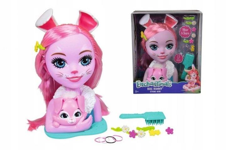 Głowa z długimi włosami i licznymi akcesoriami do czesania i upinania włosów.
