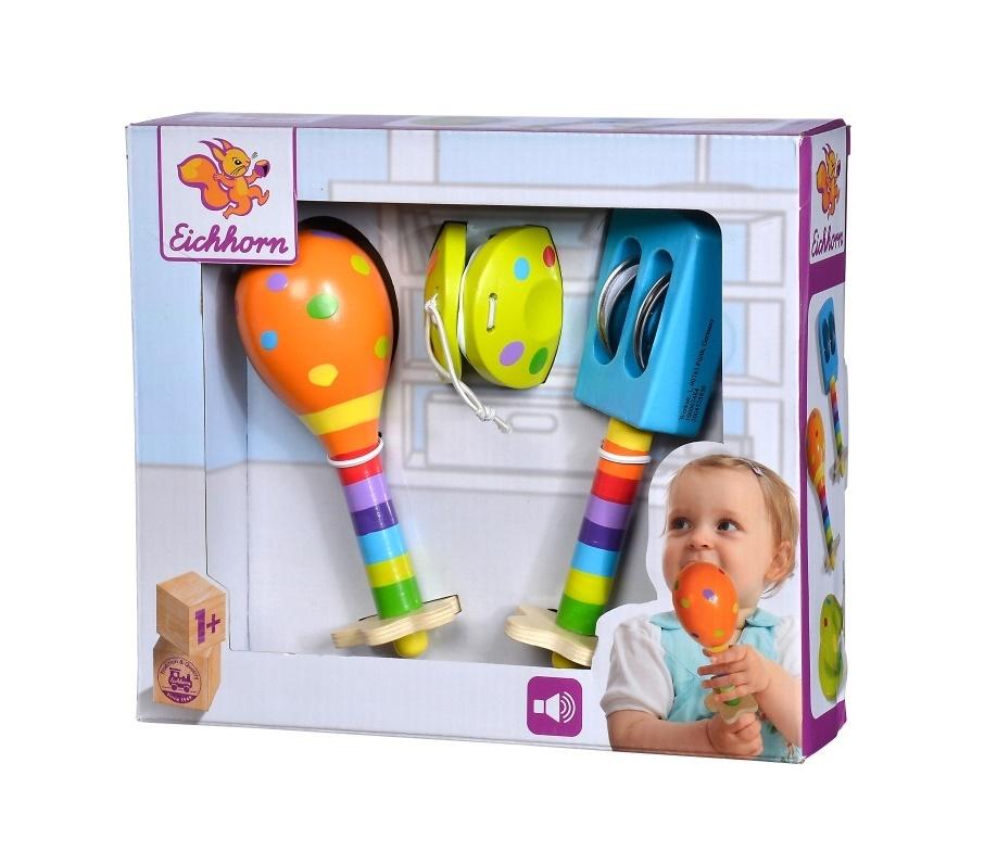 Dzięki zestawowi Eichhorn muzycznemu dzieci stają się aktywne muzycznie z grzechotką, kastanietem i maraką. Każdy z instrumentów jest kolorowo pomalowany i wydaje duże odgłosy. Odpowiednie dla dzieci powyżej jednego roku życia.