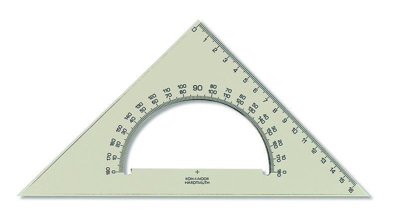 Ekierka równoramienna wykonana z dymionego tworzywa sztucznego. Ekierka wyposażona jest w kątomierz oraz precyzyjną skalę. Posiada podcięcie na dwóch krawędziach, dzięki czemu przy kreśleniu tuszem, kreski nie rozmazują się.