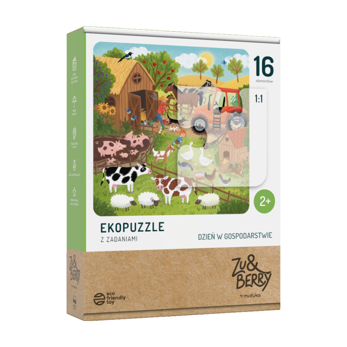 16-elementowy zestaw puzzli ukazuje pracowity dzień na wsi. Układanie puzzli jest dobrym narzędziem wspomagającym motorykę małą u dzieci. Daje też okazję do rozmowy o tym, jakie zwierzęta żyją na wsi oraz na czym polega praca rolnika. Do zestawu dołączone są zadania, które pozwalają ćwiczyć umiejętności liczenia i właściwego nazywania przedmiotów. Pomocnikami w zabawie są surykatka Zu i alpaka Berry (tekturowe figurki do samodzielnego złożenia). Dodatkowo dajemy drugie życie pudełku! Wnętrze można pokolorować, a po jego rozłożeniu ukazują się historie dotyczące bohaterów serii.