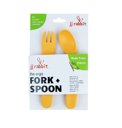 EkoSztućce - Łatwo złapać, łatwo jeść. Bezpieczne dla dziecka, przyjazne dla Ziemi. Spraw aby każdy posiłek dla dziecka był przyjemnością. Pamarańczowe ekoSztućce ergoFork+Spoon mają ergonomiczny kształt. Łyżeczka i widelec kształtem dopasowane są do rączek małego dziecka, dzięki czemu są łatwe do chwytania i używania przez malucha. Wygięte główki łyżeczki i widelca sprzyjają samodzielnemu jedzeniu. Ergonomiczne ekoSztućce zaprojektowano w taki sposób, aby wprost zachęcać dzieci do sięgnięcia po nie - żywy pomarańczowy kolor, przyciągający wzrok dziecka oraz ergonomiczny kształt. Przyjemny w dotyku bio-plastik sprawia, że jedzenie jest bezpieczną przyjemnością dla malucha i rodzica. ekoSztućce od JJ Rabbit to nie tylko produkt niezwykle przydatny i zabawny, lecz także w pełni bezpieczny dla dziecka oraz przyjazny naszej planecie. EkoSztućce w 100% wyprodukowany jest z bio-plastiku, powstającego z przetworzonych roślin. Dzięki temu nie zawierają one żadnych szkodliwych dla dziecka substancji, w tym m.in. BPA., ftalanów, PVC. Bio-plastik wykonany jest z cukrów i skrobi pochodzących z roślin takich jak kukurydza i trzcina cukrowa. Podczas produkcji bio-plastiku zużywanych jest mniej paliw kopalnych, emitowanych jest mniej gazów cieplarnianych, a przy tym bio-plastik daje więcej możliwości recyklingu niż jakikolwiek inny rodzaj plastiku. EkoSztućce ergoFork+Spoon: biodegradowalne, zrobione z roślin, łatwe w przechowywaniu, można myć w zmywarce, mają ergonomiczny kształt, do kompletu z ekoKubeczkiem oraz ekoTalerzykami, nie zawierają BpA, ftalanów, PVC - 100% bezpieczne dla Twojego dziecka., przeznaczone dla dzieci od 9 miesiąca życia.