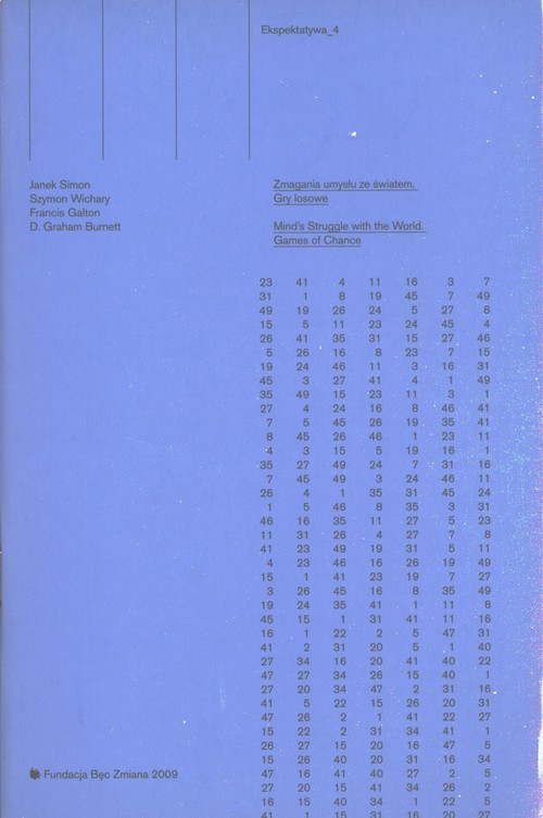 Janek Simon i Szymon Wichary – artysta oraz psycholog – wyjaśniają zawiłości ludzkiej psychiki dającej wiarę niezliczonej ilości metod pozwalających odnieść sukces w grach liczbowych. Szukanie sensu w bezsensie, wiary, nadziei jest tu zarówno światełkiem w tunelu, jedyną szansą dla osób, którym nie pozostała już żadna inna opcja poprawienia swojego statusu, jak również próbą znalezienia drogi na skróty, pozwalającą zdobyć nieskończoną przewagę nad innymi. Spis treści: Graficzne opracowanie systemów totolotka, Janek Simon Statystyczne badania nad skutecznością modlitwy, Francis Galton Gry losowe, G. Graham Burnett Zmagania umysłu ze światem. Opowieść o kilku prostych mechanizamach. Szymon Wichary