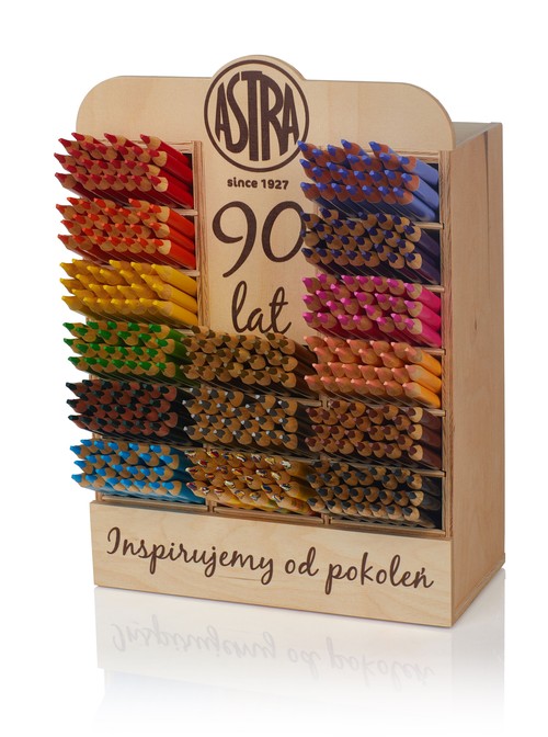 Duży drewniany ekspozytor zawierający kredki ołówkowe - 360 sztuk w 15 kolorach.
