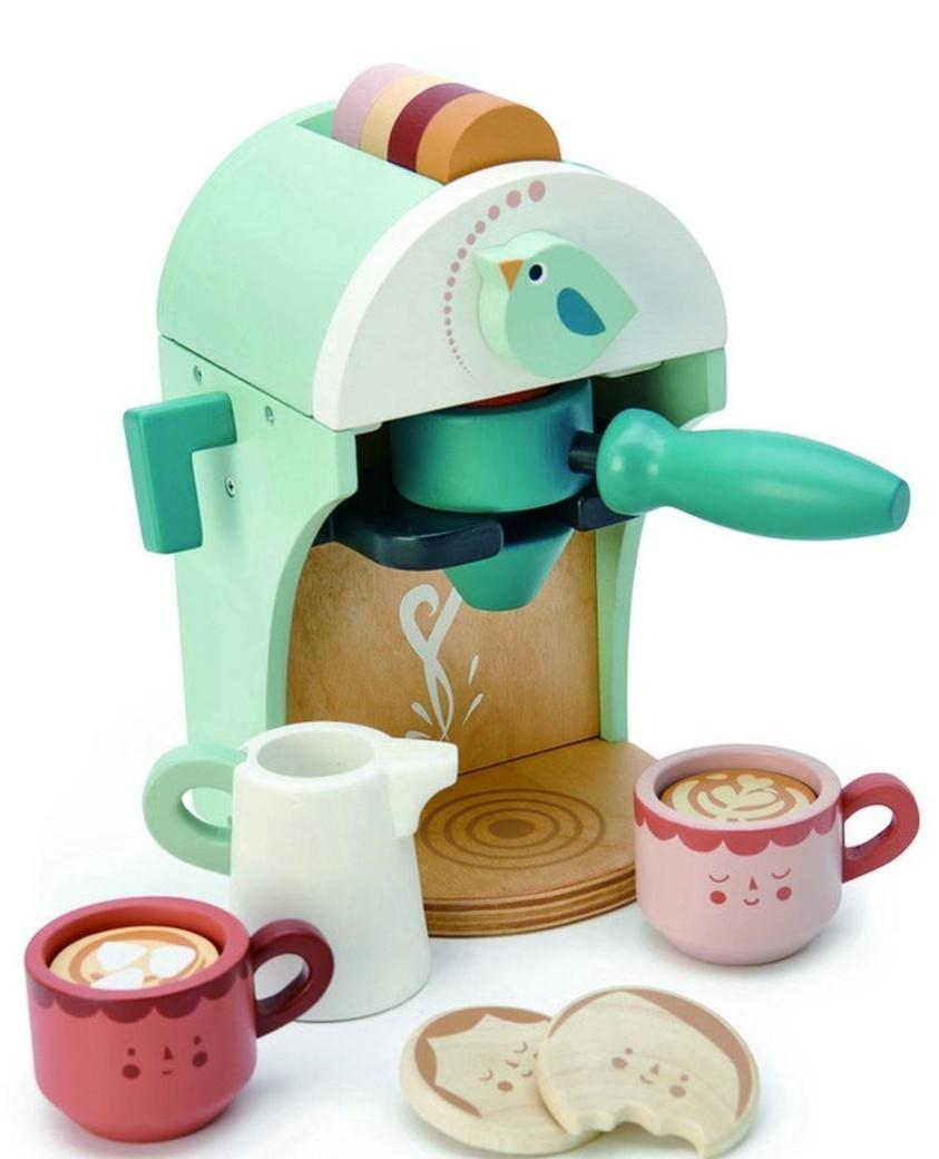 Drewniany ekspres do kawy na kapsułki, Tender Leaf Toys Wciel się w rolę baristy i przyrządzaj pyszne kawy! Nasz drewniany ekspres do kawy sprawdzi się zarówno podczas zabawy w domową kawiarnie jak i będzie idealnym dodatkiem do zabawkowej kuchni! Przyrządzaj pyszne kawy za pomocą naszego ekspresu! W zestawie jest 5 kolorowych kapsułek - każda do przygotowania innej kawy! Masz ochotę na latte czy cappuccino? Serwuj je w kolorowych kubeczkach z mlekiem lub bez. Wspaniała zabawa i nauka kreatywnego odgrywania ról oraz rozwój zdolności manualnych! W zestawie znajdziesz piękny ekspres do kawy z pokrętłem, 2 filiżanki, 5 kolorowych kapsułek, dzbanuszek na mleko oraz 2 ciasteczka. Nasze zabawki produkowane są z drzewa kauczukowego, pochodzącego z kraju położonego na 13 tysiącach rajskich wysp - Indonezji. Do ich pomalowania użyliśmy bezpiecznych i delikatnych farb, dzięki czemu drewno zachowało swój naturalny wygląd i widoczną strukturę. Drewno kauczukowe cechuje się wyjątkową wytrzymałością, co jest niewątpliwym atutem zabawek Tender Leaf Toys. W trosce o naturę, w miejsce każdego drzewa wykorzystanego do produkcji zabawek Tender Leaf Toys, sadzimy nowe drzewo. W Tender Leaf Toys dbamy o zrównoważony rozwój planety i ochronę środowiska naturalnego. Zabawki Tender Leaf Toys tworzone są z myślą o najmłodszych przez brytyjską projektantkę Danielle Hanson, która od lat związana jest z branżą dziecięcą. Dzięki jej doświadczeniu, pasji i niezwykłej wyobraźni, zabawki marki Tender Leaf Toys pięknie odwzorowują detale otaczającego nas świata, jak również dbają o rozwój zdolności manualnych i poznawczych dzieci. Wszystkie etapy produkcji zabawek Tender Leaf Toys odbywają się w jednym miejscu, z najwyższą dbałością o środowisko - w egzotycznej Indonezji, kraju słynącym z poszanowania dla własnej kultury i zasobów naturalnych.