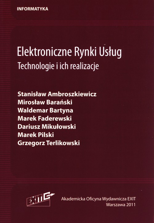 Przedmowa 1. Wprowadzenie do elektronicznych rynków usług 2. Uwarunkowania prawne i technologiczne dotyczące społeczeństwa informacyjnego 3. Paradygmat SOA 4. Elektroniczne procesy biznesowe 5. Propozycja realizacji ERU - koncepcja platformy ELA-enT 6. Słownik EntishDictionary 7. ELA-enT: Specyfikacja języka i protokołów 8. Implementacja platformy ELA-enT Bibliografia Skorowidz