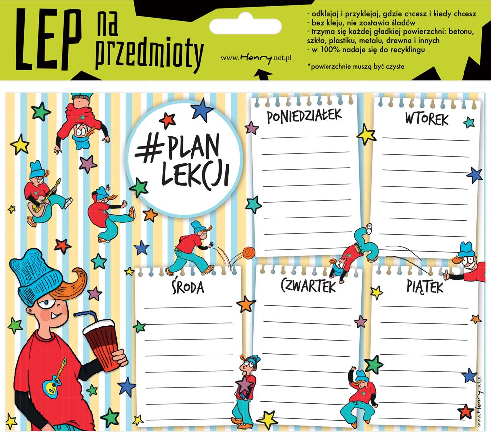 LEP NA PRZEDMIOTY - plan lekcji A5. Naklejka elektrostatyczna w formacie A5. BEZ KLEJU, NIE ZOSTAWIA ŚLADÓW. Przywiera do każdej gładkiej powierzchni: szkła, mebli, metalu, betonu. Przyklej na ścianie, biurku, lodówce i wielu innych. Wielokrotnego użytku, odklejaj i przyklejaj gdzie chcesz. Można używać pisaków suchościeralnych. Okres ważności od pierwszego użycia 6 miesięcy. 100% produktu podlega recyklingowi