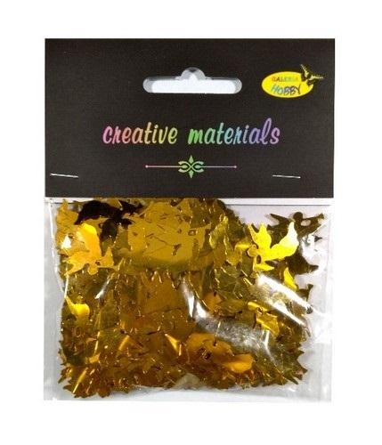 Elementy wykonane z metalizowanej twardej folii PET w kształcie anioła w kolorze złotym. Opakowanie zawiera 15 g. elementów