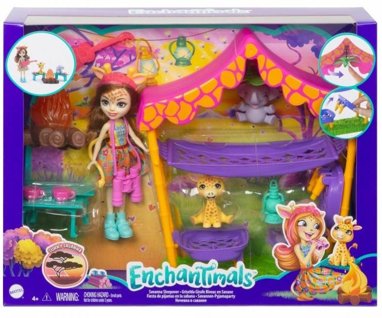 Przemierzaj Promienną Sawannę z lalką Griseldą Giraffe i jej zwierzęcymi przyjaciółmi! Zestaw do zabawy Enchantimals Biwak na sawannie jest pełen elementów inspirujących do opowiadania własnych historyjek. Przysiądź na ławeczce przy ognisku, aby spędzić wesoło czas w stylu Enchantimals dzięki takim akcesoriom jak gitara, kubeczki, latarenka i nie tylko. A potem połóż się w namiocie i śnij słodko o przygodach na sawannie. Lalka Griselda Giraffe może się ułożyć na hamaku pod liściastym obracającym się wiatrakiem. Jej przyjaciele żyrafka Antenna i słonik Stompah też mają swoje łóżeczka. Dzieci pokochają wyjątkową więź, jaka łączy bohaterów ze świata Enchantimals! Kolory i elementy dekoracyjne mogą się różnić.