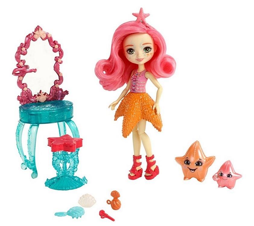 Te wodne zestawy inspirowane światem Enchantimals z 15-centymetrową lalką, dwoma zwierzęcymi pupilami i akcesoriami zrobią prawdziwą furorę. Do wyboru zestaw z lalką Starling Starfish, dwoma zaprzyjaźnionymi rozgwiazdami i toaletką (ze stolikiem, krzesełkiem i produktami kosmetycznymi) oraz zestaw z lalką Cameo Crab, dwoma krabami i zestawem plażowym (z basenem, zjeżdżalnią i zabawkami do basenu).