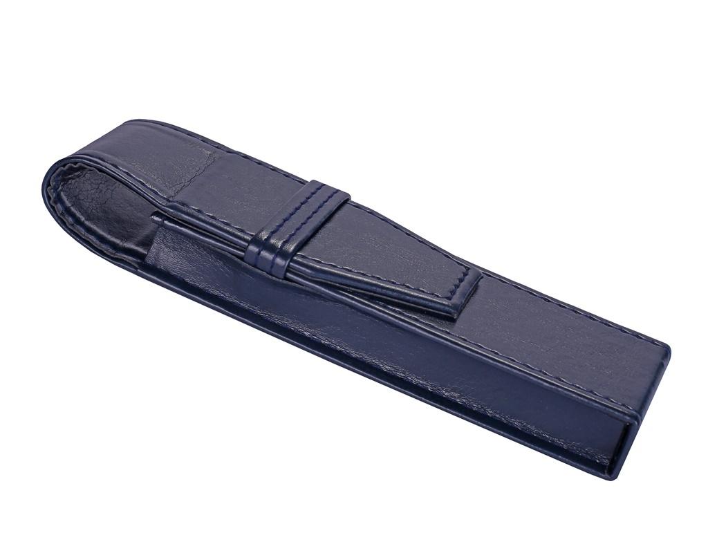 Etui na długopisy wykonane ze skaju, zamykane na przewlekany pasek. Etui o wymiarach 17x4,5x1,8[cm]. Kolor granatowy