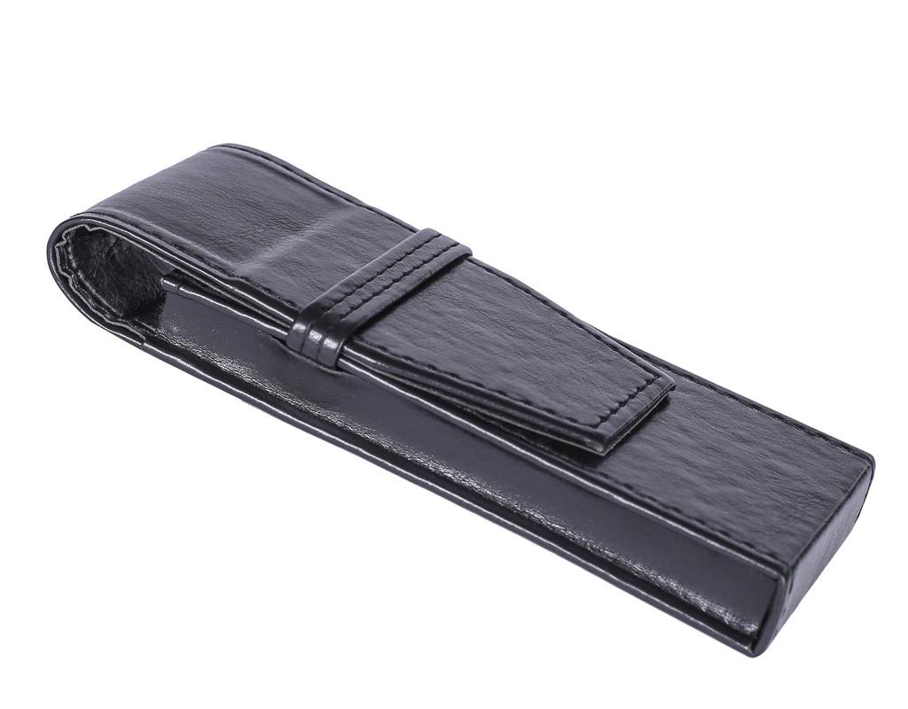 Etui na długopisy wykonane ze skaju, zamykane na przewlekany pasek. Etui o wymiarach 17x6x1,8[cm]. Kolor czarny