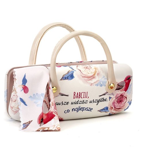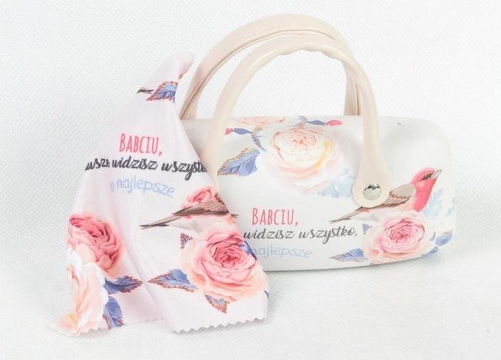 "*etui na okulary z dedykacją „Babciu, zawsze widzisz wszystko co najlepsze” *wyposażone w dodatkowe uchwyty do trzymania *wyściełane wnętrze *w środku ściereczka do szkieł z taką samą grafiką co na etui *doskonały pomysł na prezent dla babci, nie tylko z okazji jej święta *wymiary etui (bez rączek): 7x16x5 cm *wymiary ściereczki: 14,5x14,5 cm"