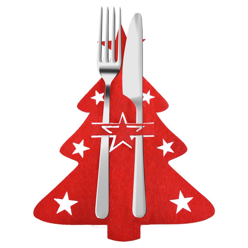 Etui na sztućce w kształcie choinki z gwiazdkami. Idealne do aranżacji świątecznego stołu. 3 kolory do wyboru: szary, zielony i czerwony. Wielkość: 21x17 cm. 4 sztuki w opakowaniu.