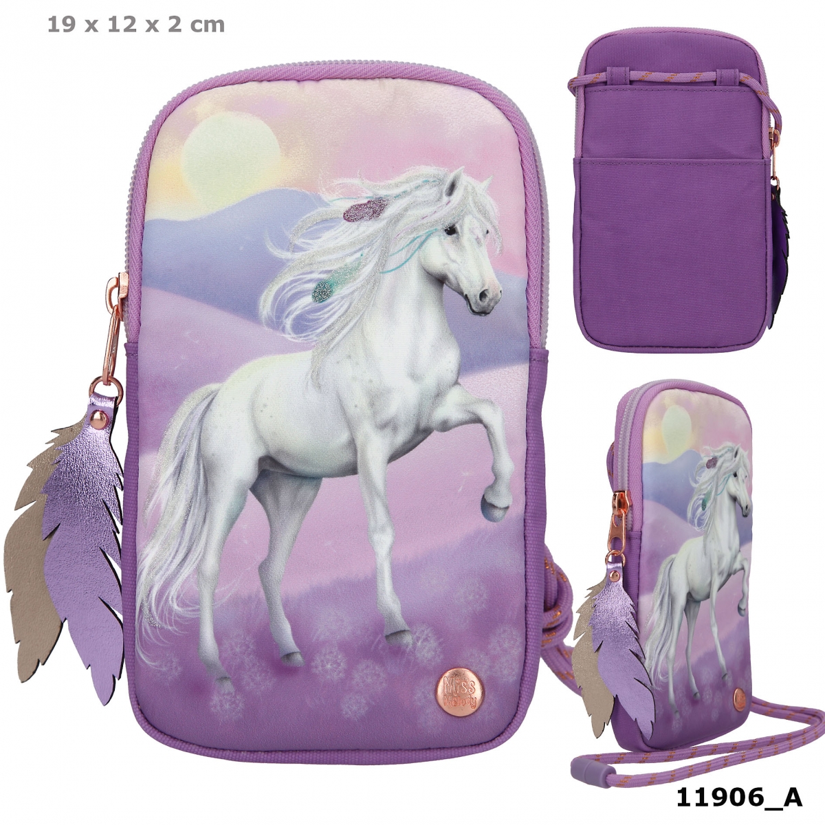 Torebka etui na telefon Miss Melody Violet Dreams, część na smartfona zapinana na suwak, w środku podziałka, z tyłu torebki mała wsuwana kieszonka. Etui na długim sznurku. Materiał poliester.