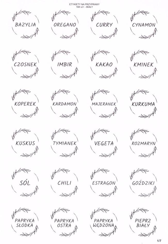 Zestaw naklejek funkcyjnych na słoiki lub inne pojemniki z przyprawami, średnica 40mm. kolor białe