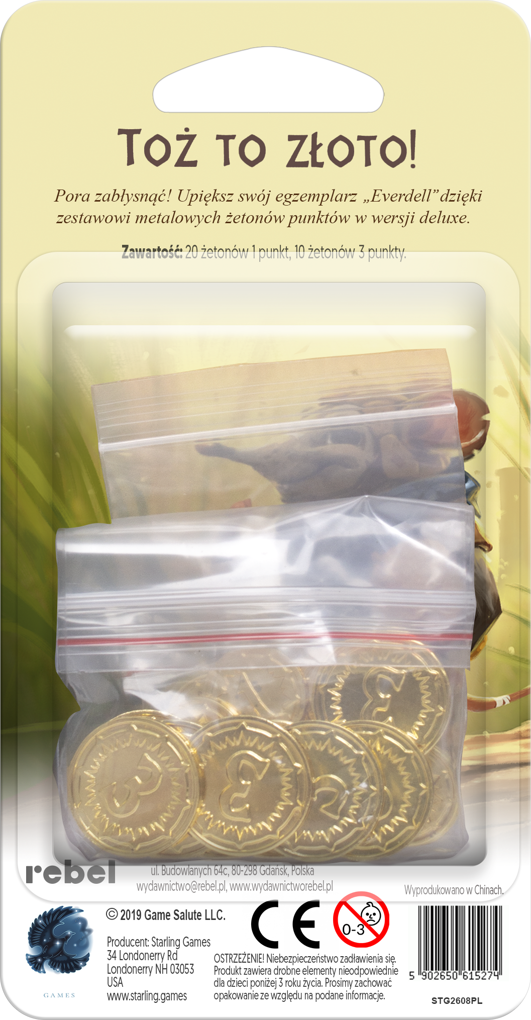 Już dziś rozszerz swoją kolekcję wyjątkowych akcesoriów i zastąp standardowe znaczniki punktów zwycięstwa zestawem metalowych monet! W połączeniu z dopracowaną stylistyką i wysoką jakością wykonania elementów podstawowych Everdell, stanowią one ciekawy dodatek podnoszący przyjemność z gry.