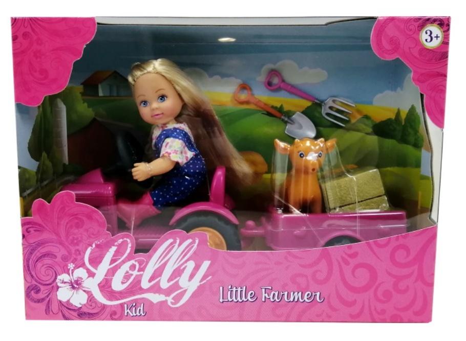 Evi w roli farmerki, która przemieszcza się na traktorze z przyczepką, laleczka przewodzi baranka oraz belki siana, dołączone widły i łopata, laleczka ubrana w strój tematyczny i kalosze, wysokość lalki: 12 cm, 3l+