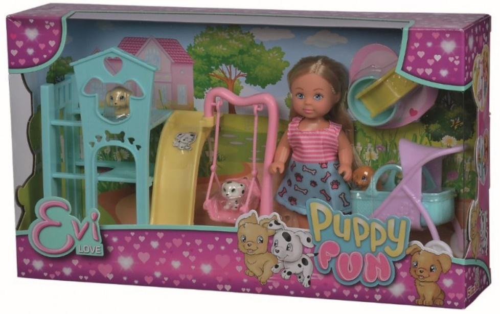 Evi otacza opieką 3 szczeniaczki na placu zabaw z huśtawką, dołączony wózek dla pupuli, wysokość lalki: 12 cm, 3l+