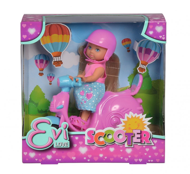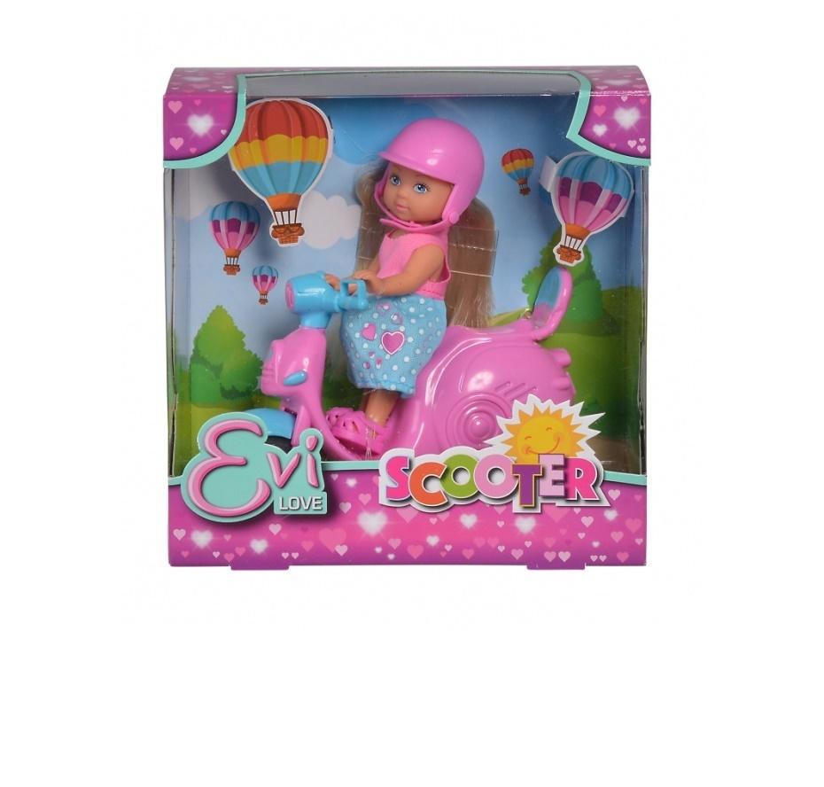 Laleczka Evi na różowym skuterze. Laleczka posiada niebieską spudniczkę, różowy kask i różową koszulkę.