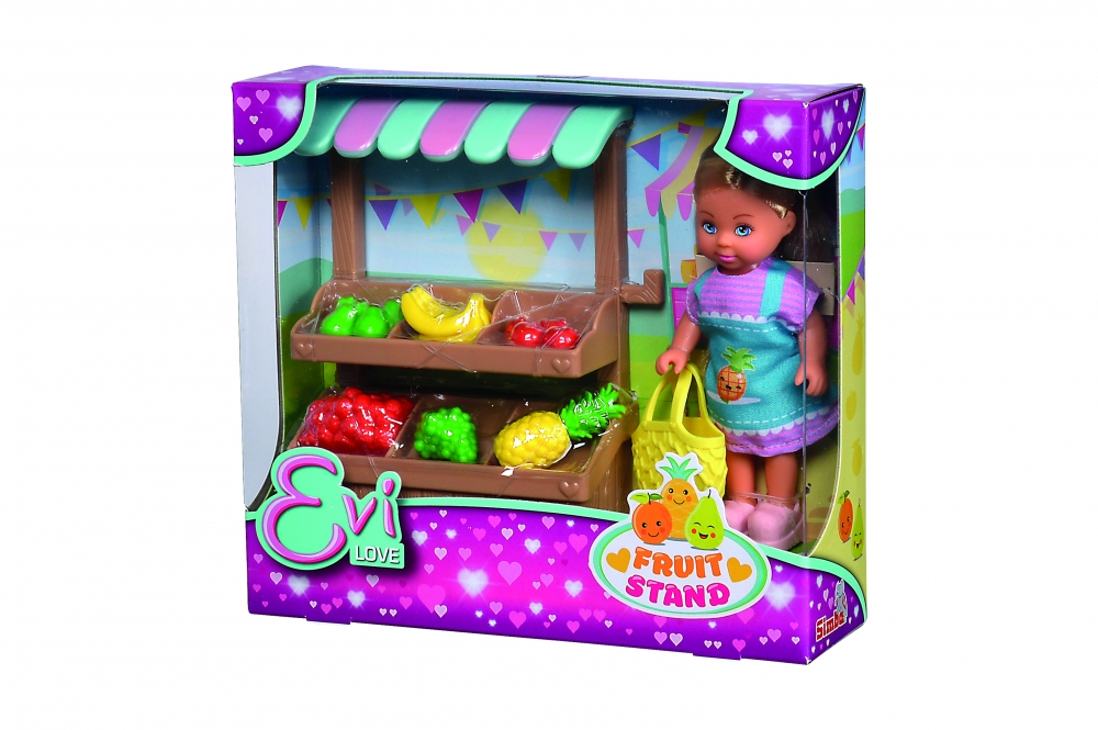 Evi ubrana w uroczy fartuch wybiera się na targ z żywnością, aby zrobić zdrowe zakupy. Dołączone stoisko z jedzeniem zawiera 6 różnych owoców a Evi może zabrać je ze sobą w siatkowej torbie. Stoisko posiada dwie półki i baldachim chroniący przed słońcem lub deszczem. Wysokość lalki 12 cm