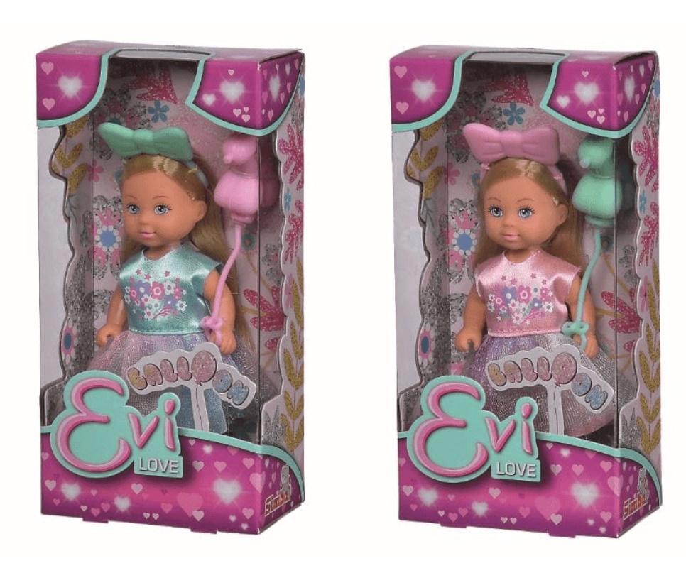 Laleczka Evi w uroczym, pastelowym stroju, wdzięku dodaje tiulowa spódniczka i dopasowana kokarda na głowie oraz balon w rączce, wysokość lalki: 12 cm, 3l+