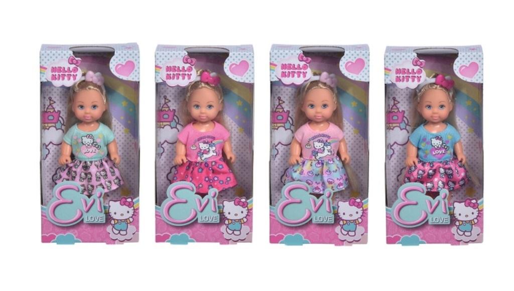 Lalki Evi w sukienkach letnich z nadrukiem popkulturowej postaci Hello Kitty, stylizację dopełnia opaska na włosach.