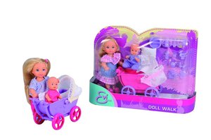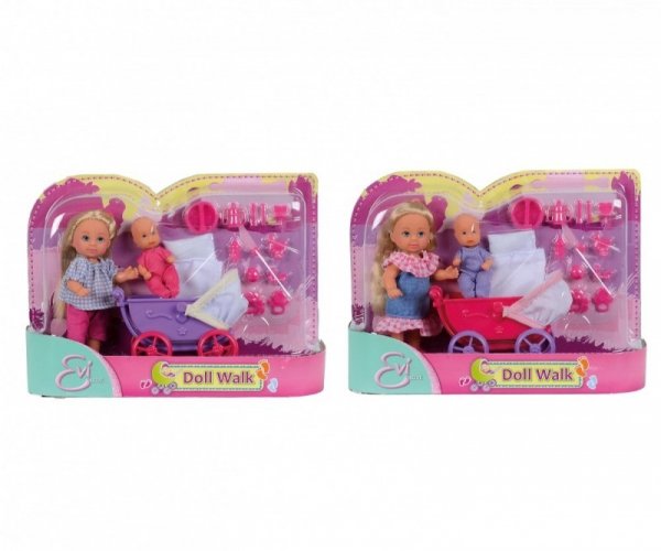 Laleczka Evi idzie na spacer z młodszym braciszkiem. Wózek ma opuszczaną budkę, w środku jest kołderka i poduszeczka. Jest również zestaw do karmienia i zabawy. Zabawka jest przeznaczona dla dzieci powyżej 3 roku życia.