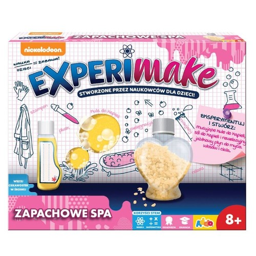 Zestawy naukowe ADDO EXPERIMAKE zostały zaprojektowane przez naukowców, aby zachęcić dzieci do nauki poprzez zabawę. Zgodnie z ideą STEM (nauka, technologia, inżynieria, matematyka) każdy zestaw rozwija co najmniej dwie z tych umiejętności. Produkty EXPERIMAKE nie tylko wspierają edukację najmłodszych, ale przynoszą im wiele radości podczas zabawy oraz angażują rodziców w odkrywanie świata nauki. Czy może być coś lepszego niż wspólna inspirująca zabawa? Zestaw będzie idealny dla dziewczynek. Stwórz musujące kulki do kąpieli, perfumowaną sól do kąpieli, naturalne olejki eteryczne, peeling do ciała oraz kosmetyk pod prysznic. Przelej swoje kosmetyki do uroczej butelki w kształcie serca i ciesz się własnymi kosmetykami podczas każdej kąpieli! W zestawie: 1 para rękawiczek ochronnych, żółty barwnik kosmetyczny (3ml), zapach jabłkowy (3ml), sól morska (100g), kosmetyk oczyszczająca (20ml), środek zagęszczający (10g), środek zmiękczający (5ml), wzmacniacz piany (5ml) (10g), wodorowęglan sodu (15g), mała miseczka pomiarowa z pokrywką, duża miseczka pomiarowa, 2 drewniane łopatki, 1 plastikowa łopatka, 4 pipety, kolba w kształcie serca, butelka szamponu, 1 arkusz etykiet Uwaga: Do doświadczeń mogą być potrzebne produkty spoza zestawu. Wiek: 8+