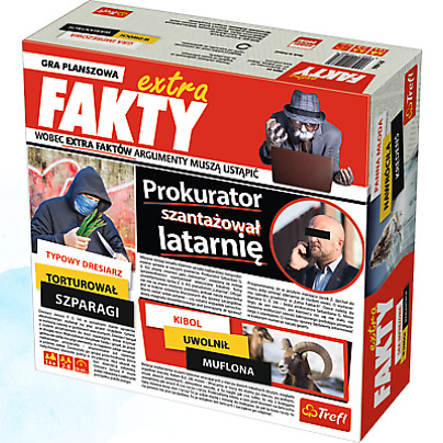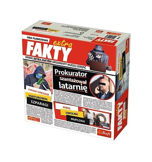 W grze Extra FAKTY gracze wcielają się w dziennikarzy pracujących dla opiniotwórczego tabloidu o nieco wątpliwej renomie. Dwa tryby rozgrywki, to dwa razy więcej zabawy, w trakcie której gracze będą się prześcigać w budowaniu najciekawszych nagłówków. Każdy tytuł składać się będzie z trzech elementów, a od inwencji i pomysłowości uczestników zabawy zależy, czy tematem artykułu okaże się sensacyjna wpadka, nieprzyzwoite zachowanie, czy miłosna intryga. Zawartość pudełka: Duża plansza 4 małe plansze 156 płytek tytułów w trzech kolorach (białym - płytki podmiotu, żółtym - płytki orzeczenia, czarnym - płytki dopełnienia) Kość Instrukcja Wiek graczy: 14+ Liczba graczy: 2-8 Czas rozgrywki: 20-60 minut