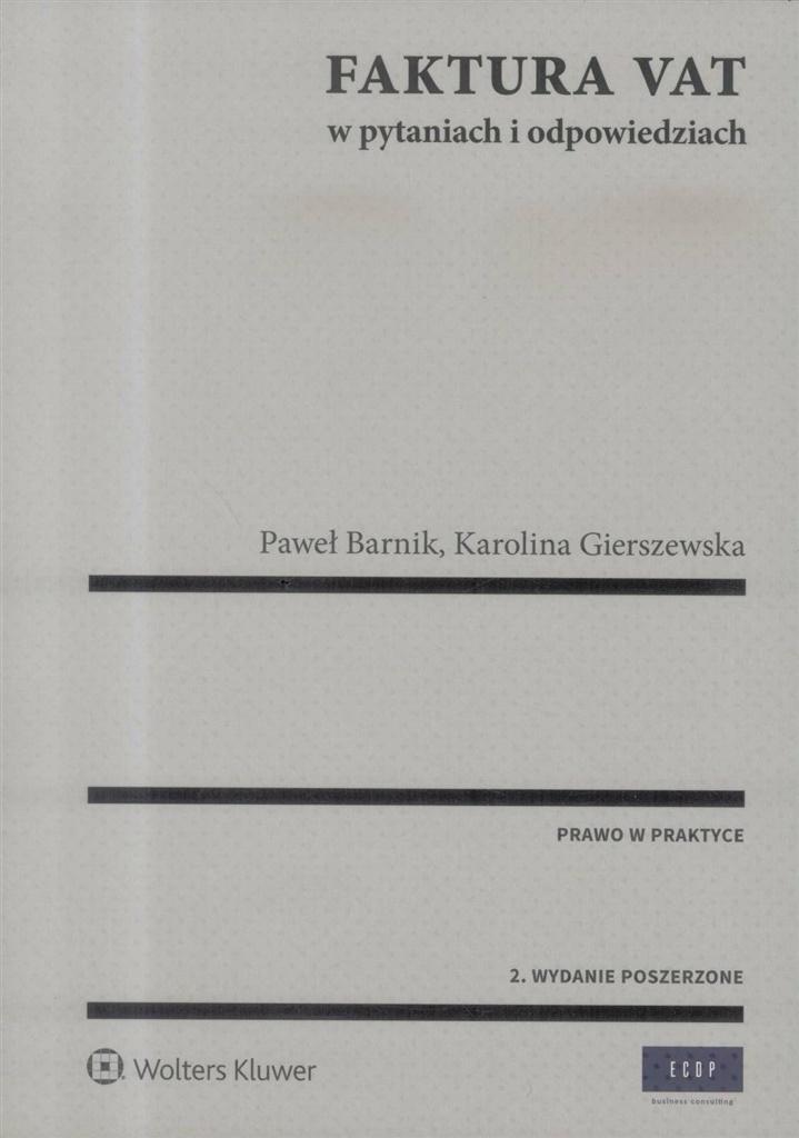 Faktura VAT w pytaniach i odpowiedziach to publikacja, która w formie krótkich pytań i przystępnych odpowiedzi omawia przepisy ustawy o podatku od towarów i usług dotyczące wystawiania faktur. Informacje w niej zawarte pozwolą uniknąć błędów związanych z wystawianiem i akceptowaniem faktur. W drugim wydaniu książki usystematyzowano tematykę związaną z: - rodzajami faktur, ich obowiązkowymi elementami, - prawidłową datą wystawienia/sprzedaży, - sposobem korygowania błędów na fakturach i wszelkimi wątpliwościami jakie powstają w toku ich wystawiania i przechowywania. W opracowaniu w sposób unikalny zaprezentowano obowiązujące przepisy prawa podatkowego oraz zawarto wiele przykładów obrazujących wątpliwości podatników, wzbogacone aktualnym orzecznictwem judykatury, jak i stanowiskiem organów podatkowych. Autorzy – doradcy podatkowi, doświadczeni praktycy specjalizujący się w zagadnieniach związanych z podatkiem od towarów i usług oraz postępowaniem przed organami podatkowymi i sądami administracyjnymi – odpowiedzieli na najczęściej zadawane pytania związane z wystawianiem faktur. Zaprezentowali także ich graficzne przykłady. W przystępny sposób omówili również regulacje związane z kursami walut, które należy zastosować gdy mamy do czynienia z tzw. fakturą walutową.