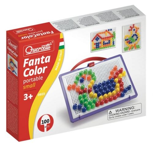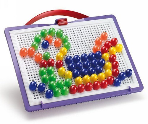 Dzieci mogą tworzyć swoje pierwsze mozaiki lub kopiować przykłady z albumu. Zabawa polega na wstawianiu różnej wielkości, niełamliwych kołeczków w perforowaną tablicę. Gotową mozaikę można powiesić na ścianie, tak aby udekorować pokój w oryginalny sposób. Wszystkie elementy przechowywane są w poręcznej walizeczce, którą można swobodnie przenosić. Zabawka rozwija kreatywność oraz ćwiczy koordynację wzrokowo-ruchową. Zawartość: 100 dużych kołeczków, walizka, album z przykładami do odzorowania.