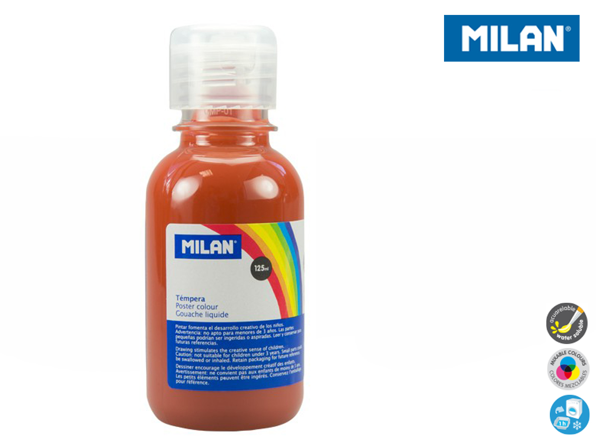 Farba tempera 125 ml w kolorze brązowym. Farby tempery zawierają bardzo dużo pigmentu. Są gęste przez co bardzo dobrze kryją malowaną powierzchnię. Żywe, intensywne kolory zachęcają dzieci do pracy. Idealne do bezpośredniej aplikacji lub po rozcieńczeniu wodą. Łatwo się spierają niemal z każdej powierzchni. Przezroczysta butelka ze specjalnym aplikatorem. Farby MILAN są zgodne z europejskimi i amerykańskimi normami bezpieczeństwa. Nie zawierają ftalanów, metali ciężkich i innych substancji toksycznych. Są bezpieczne dla dzieci.