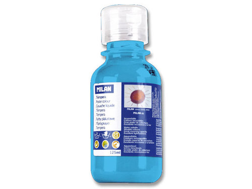Farba tempera 125 ml w kolorze cyjan (jasny niebieski). Farby tempery zawierają bardzo dużo pigmentu. Są gęste przez co bardzo dobrze kryją malowaną powierzchnię. Żywe, intensywne kolory zachęcają dzieci do pracy. Idealne do bezpośredniej aplikacji lub po rozcieńczeniu wodą. Łatwo się spierają niemal z każdej powierzchni. Przezroczysta butelka ze specjalnym aplikatorem. Farby MILAN są zgodne z europejskimi i amerykańskimi normami bezpieczeństwa. Nie zawierają ftalanów, metali ciężkich i innych substancji toksycznych. Są bezpieczne dla dzieci.