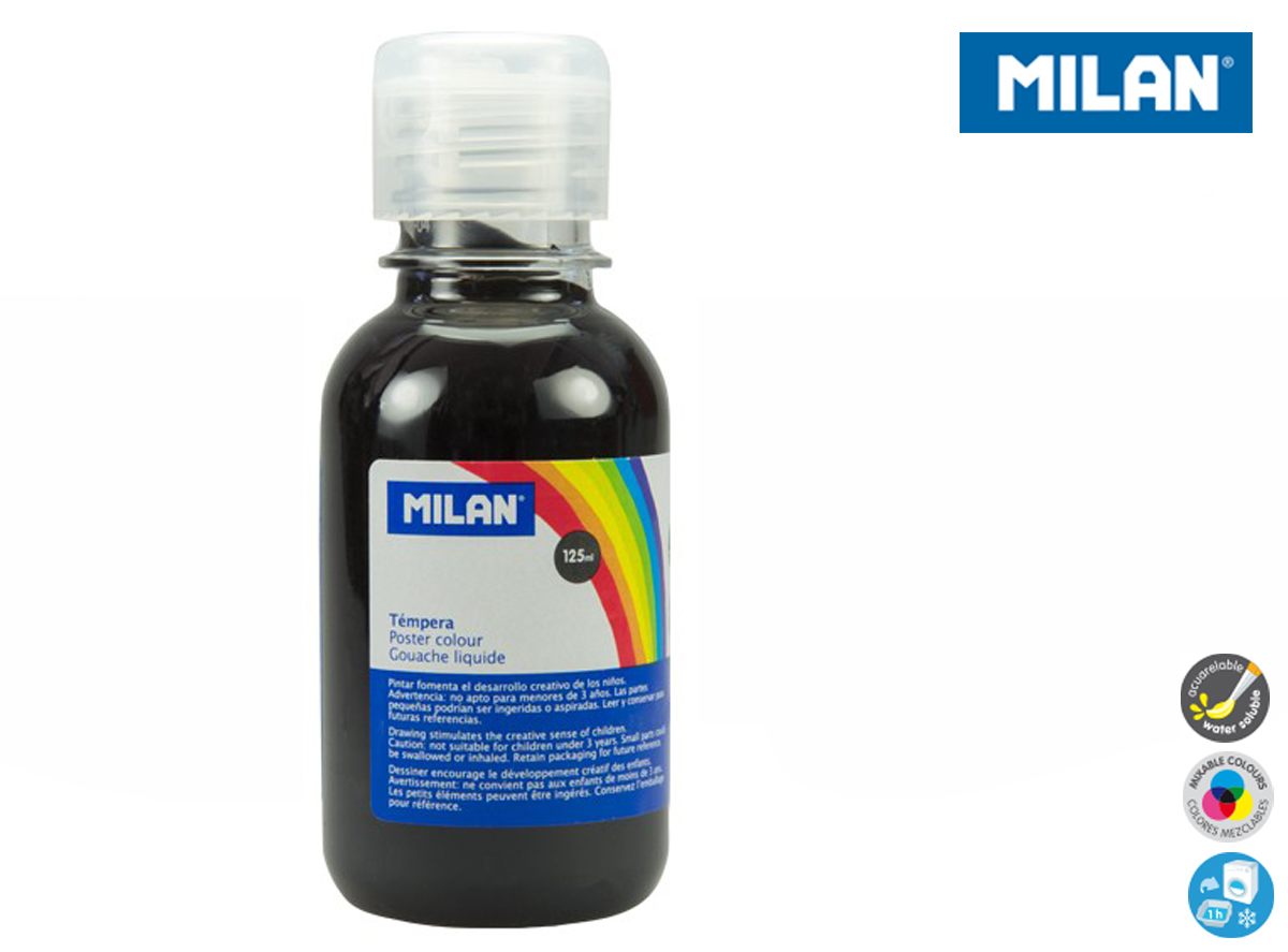 Farba tempera 125 ml w kolorze czarnym. Farby tempery zawierają bardzo dużo pigmentu. Są gęste przez co bardzo dobrze kryją malowaną powierzchnię. Żywe, intensywne kolory zachęcają dzieci do pracy. Idealne do bezpośredniej aplikacji lub po rozcieńczeniu wodą. Łatwo się spierają niemal z każdej powierzchni. Przezroczysta butelka ze specjalnym aplikatorem. Farby MILAN są zgodne z europejskimi i amerykańskimi normami bezpieczeństwa. Nie zawierają ftalanów, metali ciężkich i innych substancji toksycznych. Są bezpieczne dla dzieci.