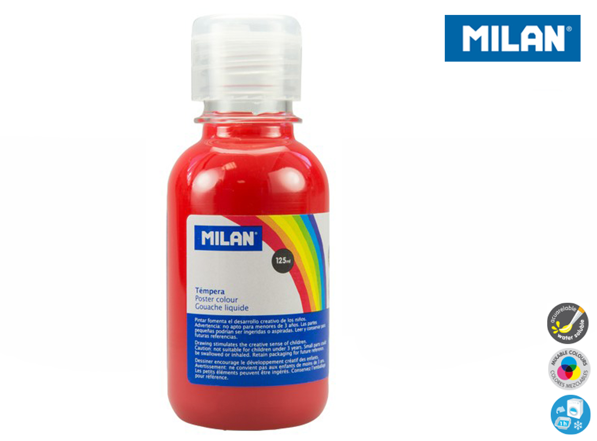 Farba tempera 125 ml w kolorze czerwonym. Farby tempery zawierają bardzo dużo pigmentu. Są gęste przez co bardzo dobrze kryją malowaną powierzchnię. Żywe, intensywne kolory zachęcają dzieci do pracy. Idealne do bezpośredniej aplikacji lub po rozcieńczeniu wodą. Łatwo się spierają niemal z każdej powierzchni. Przezroczysta butelka ze specjalnym aplikatorem. Farby MILAN są zgodne z europejskimi i amerykańskimi normami bezpieczeństwa. Nie zawierają ftalanów, metali ciężkich i innych substancji toksycznych. Są bezpieczne dla dzieci.