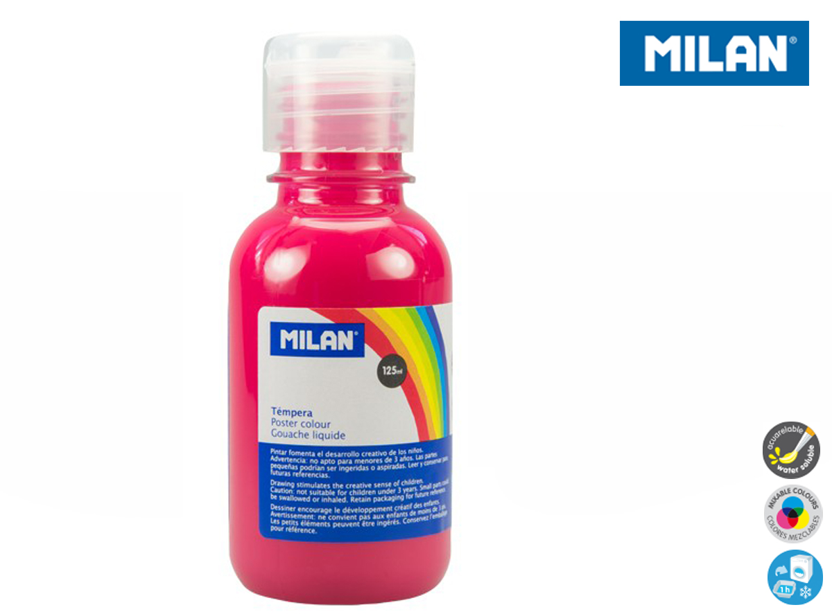 Farba tempera 125 ml w kolorze magenty (ciemnego różu). Farby tempery zawierają bardzo dużo pigmentu. Są gęste przez co bardzo dobrze kryją malowaną powierzchnię. Żywe, intensywne kolory zachęcają dzieci do pracy. Idealne do bezpośredniej aplikacji lub po rozcieńczeniu wodą. Łatwo się spierają niemal z każdej powierzchni. Przezroczysta butelka ze specjalnym aplikatorem. Farby MILAN są zgodne z europejskimi i amerykańskimi normami bezpieczeństwa. Nie zawierają ftalanów, metali ciężkich i innych substancji toksycznych. Są bezpieczne dla dzieci.