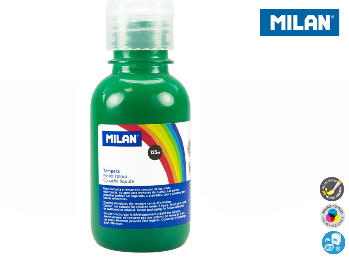 Farba tempera 125 ml w kolorze ciemnej zieleni. Farby tempery zawierają bardzo dużo pigmentu. Są gęste przez co bardzo dobrze kryją malowaną powierzchnię. Żywe, intensywne kolory zachęcają dzieci do pracy. Idealne do bezpośredniej aplikacji lub po rozcieńczeniu wodą. Łatwo się spierają niemal z każdej powierzchni. Przezroczysta butelka ze specjalnym aplikatorem. Farby MILAN są zgodne z europejskimi i amerykańskimi normami bezpieczeństwa. Nie zawierają ftalanów, metali ciężkich i innych substancji toksycznych. Są bezpieczne dla dzieci.