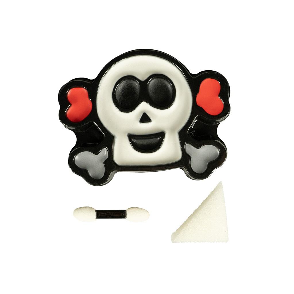 Kremowe farbki do twarzy w czterech kolorach - białym, czerwonym, szarym oraz czarnym. Opakowanie w kształcie czaszki. Do zestawu dodano gąbeczkę i aplikator do farbek. Umożliwia wykonanie charakteryzacji na bal przebierańców, halloween, przedstawienia. Opakowanie zawiera 10 g produktu.