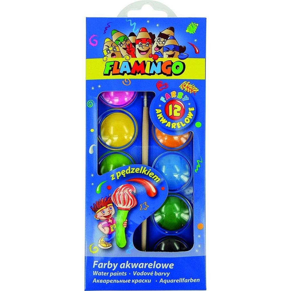 Farby akwarelowe to farby wodne służące do malowania na papierze, których cechą charakterystyczną jest czystość i transparentność plam barwnych. Farby mają postać suchych guziczków o średnicy 30 mm umieszczonych w plastikowym, zamykanym opakowaniu. Wieko opakowania może stanowić paletę do mieszania farb. Po zwilżeniu wodą niemal natychmiast uzyskuje się gotowe do użycia farby, a w zależności od sposobu użytkowania (np. ilości dodanej wody) można otrzymać różne efekty. Szybko schną, idealne dla hobbystów oraz dzieci. W komplecie pędzelek. Zestaw zawiera 12 kolorów farb. Średnica guziczka z farbą: 30 mm.