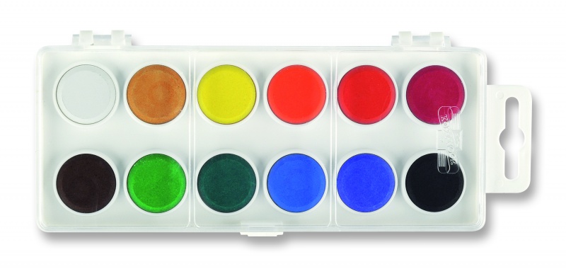 Farby akwarelowe, w plastikowym otwieranym pudełku, przeźroczyste wieko. Średnica guziczka jednego koloru 22,5mm, 12 kolorów.