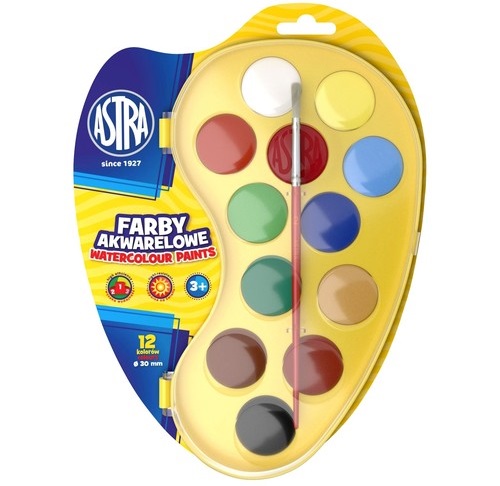 Farby akwarelowe to farby wodne służące do malowania na papierze. Mają one postać suchych guziczków, z których po zwilżeniu wodą niemal natychmiast uzyskuje się gotowe do użycia farby. Akwarele ASTRA składają się z wysokiej jakości drobno roztartych pigmentów, połączonych rozpuszczalnym w wodzie spoiwem.Oprócz pigmentów i spoiw akwarele zawierają wypełniacze, które sprawiają, że farba wysychając matowieje. Dzięki temu nakładając farbę grubiej można malować technikami zbliżonymi do gwaszu, a w większych rozcieńczeniach technikami charakterystycznymi dla akwareli. Akwarele można wykorzystywać w technikach łączenia z farbami temperowymi, plakatowymi i kredkami woskowymi ASTRA.