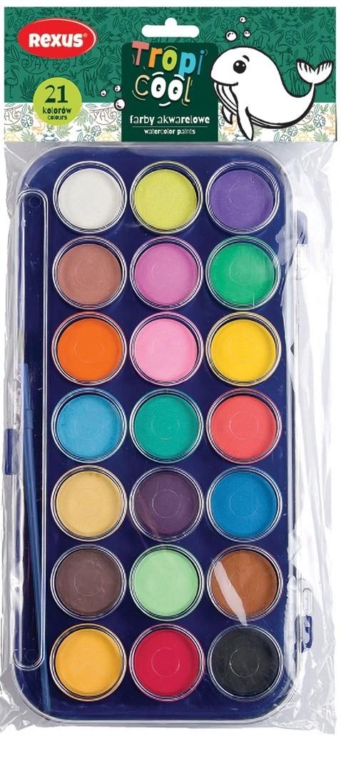 Łatwo zmywalne farby akwarelowe o bardzo dużej wydajności. Sprawdzają się podczas nauki malowania. Mogą być idealnym prezentem dla małego artysty. Dzięki wysokiej odporności na światło, kolory nie wyblakną a prace plastyczne zachowają swoje intensywne barwy przez długi czas. Składają się z wysokiej jakości drobno roztartych pigmentów, połączonych rozpuszczalnym w wodzie spoiwem. Oprócz pigmentów i spoiw akwarele szkolne zawierają pewne ilości wypełniaczy, które sprawiają, że farba wysychając matowieje. Dzięki temu nakładając farbę grubiej można malować technikami zbliżonymi do gwaszu, a w większych rozcieńczeniach technikami charakterystycznymi dla akwareli. Akwarele można wykorzystywać w technikach łączenia z farbami temperowymi, plakatowymi i kredkami woskowymi. Akwarele przeznaczone są głównie dla dzieci i młodzieży szkolnej rozpoczynającej edukację plastyczną. Dzięki swej postaci mogą być łatwo przenoszone np. w uczniowskich tornistrach oraz przechowywane przez długi czas bez obawy zmiany właściwości. Farby akwarelowe są tzw. farbami suchymi, nie wylewają się i łatwo je zmyć, dlatego są idealny dla najmłodszych artystów. Zestaw wysokiej jakości farb akwarelowych w 21 kolorach Całość zamknięta jest w plastikowym pudełku, który wraz z pędzlem tworzy gotowy zestaw do malowania i ułatwia przechowywanie.