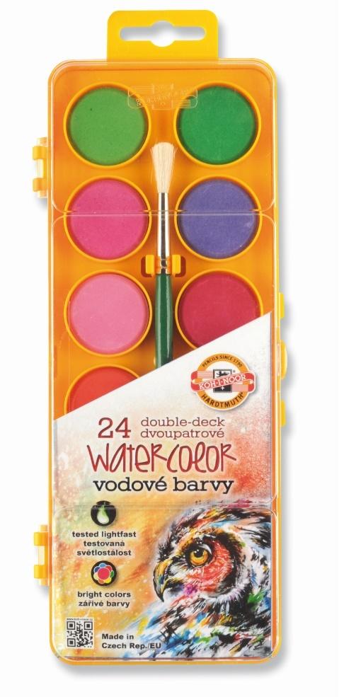 Komplet farb w plastikowym podwójnym opakowaniu zawierającym 24 kolory.
