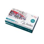 Zestaw farb akwarelowych w kostkach, o pojemności 2,5 ml w metalowej kasetce. Farby wykonane z naturalnych i syntetycznych pigmentów na bazie czystej gumy arabskiej. Doskonała jakość zastosowanych pigmentów gwarantuje czystość i transparentność kolorów. Większość kolorów w gamie powstała na bazie jednego pigmentu co, podczas mieszania, umożliwia uzyskanie czystych odcieni. Bardzo łatwo aktywują się wodą - wystarczy nabrać odrobinę farby, by uzyskać naprawdę intensywny kolor, a ich mocne napigmentowanie niezwykle korzystnie wpływa na wydajność farb.|W swojej gamie 80 kolorów posiadają 28 kostek z efektem granulacji jest to niezwykła właściwość farby, która polega na rozwarstwianiu się pigmentu zawartego w kostce na dwa, lub więcej odcieni. Efekt granulacji jest najwyrazistszy podczas malowania na papierze średnio lub gruboziarnistym, gdyż drobinki pigmentu osiadają w zagłębieniach faktury. Kolory są światło trwałe. Można je ponownie rozrabiać wodą również po wyschnięciu na palecie, dlatego świetnie nadają się w plener. Zestaw spakowany jest w metalową kasetkę, zawierającą dodatkową paletkę do mieszania farb oraz uchwyt z tyłu kasetki na kciuk do trzymania. Dodatkowo do kompletu dołączony jest wzornik kolorów do samodzielnego wykonania.|