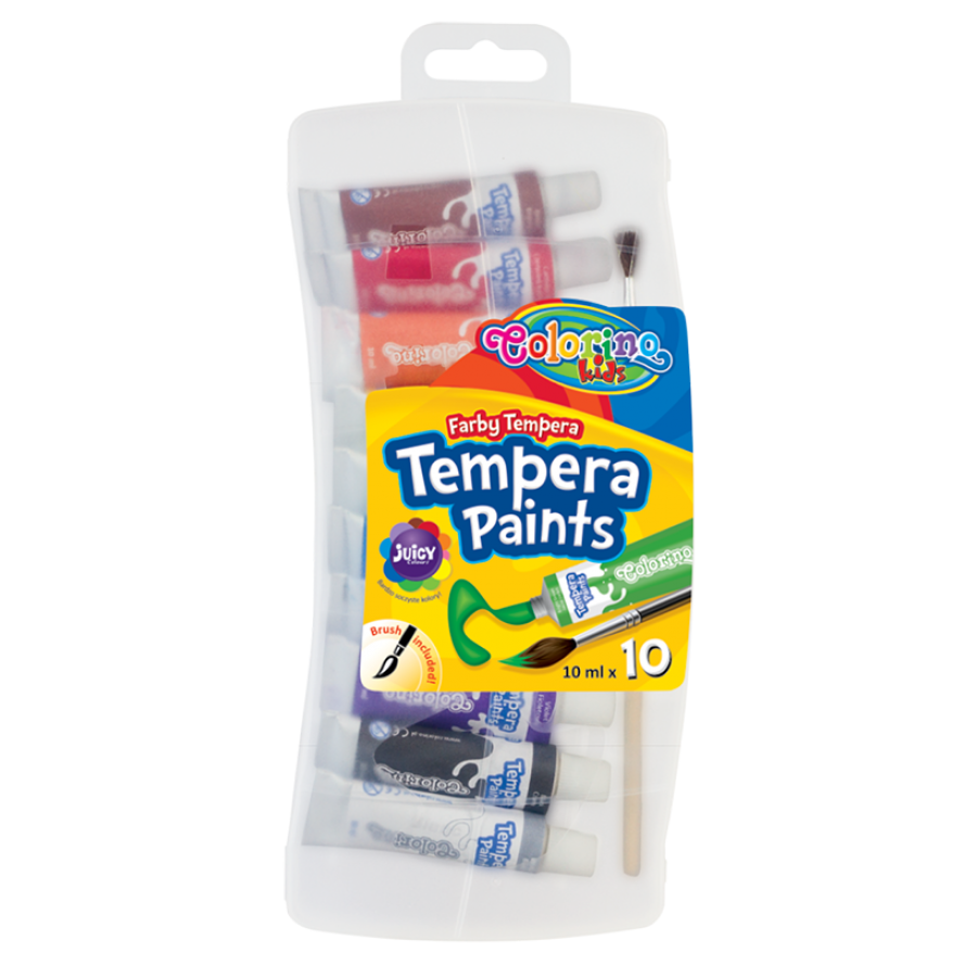 Farby Colorino Kids tempera w tubach o pojemności 10 ml z pędzelkiem, 10 kolorów. Dla dzieci w wieku od 3 lat.